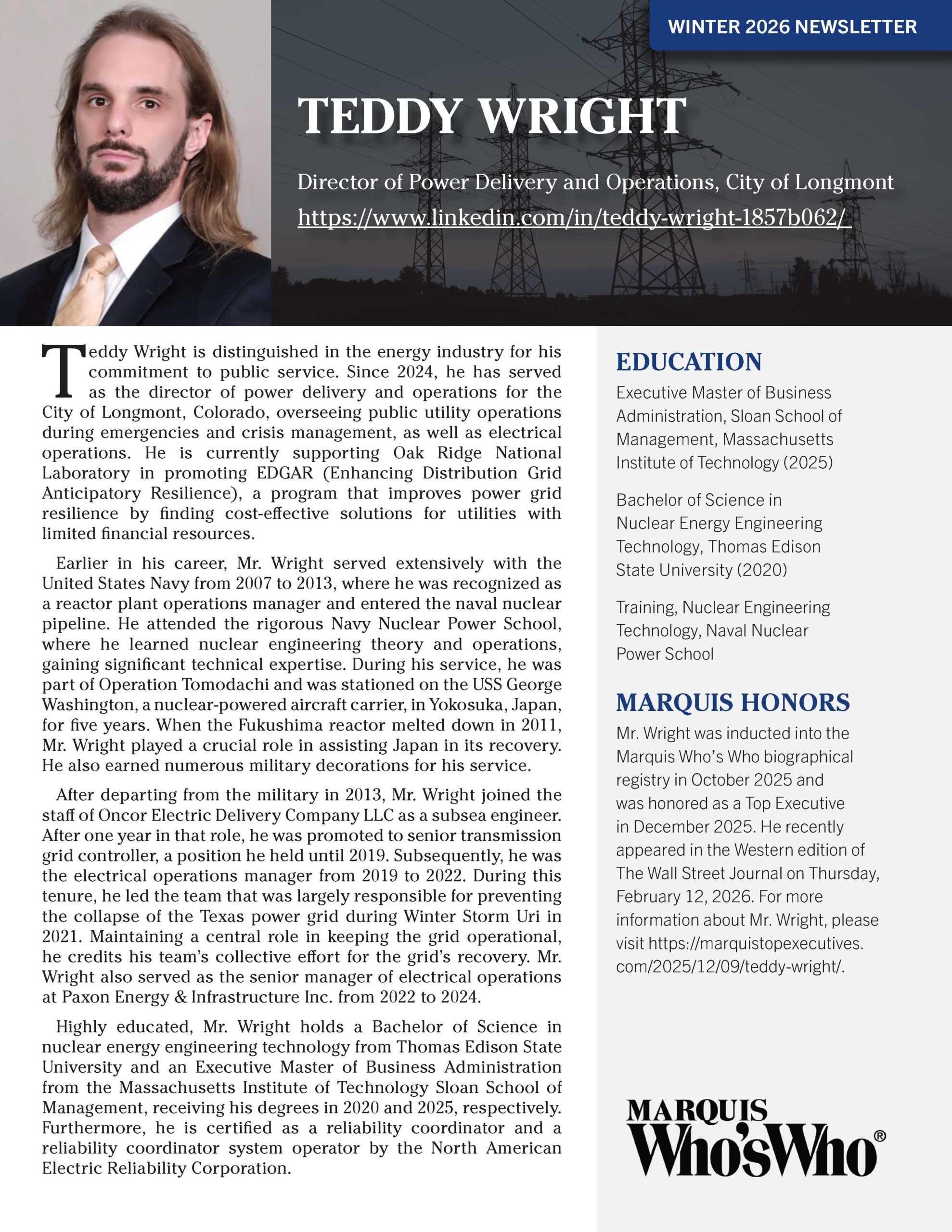 After departing from the military in 2013, Mr. Wright joined the staff of Oncor Electric Delivery Company LLC as a subsea engineer. After one year in that role, he was promoted to senior transmission grid controller, a position he held until 2019. Subsequently, he was the electrical operations manager from 2019 to 2022. During this tenure, he led the team that was largely responsible for preventing the collapse of the Texas power grid during Winter Storm Uri in 2021. Maintaining a central role in keeping the grid operational, he credits his team’s collective effort for the grid’s recovery. Mr. Wright also served as the senior manager of electrical operations at Paxon Energy & Infrastructure Inc. from 2022 to 2024.